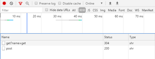 从上图可以看出,我们同时将GET和POST请求在浏览器中多提交几次,会发现不管多少次提交,POST请求都是200;而GET请求第一次200,后面的请求会304进行缓存下来。