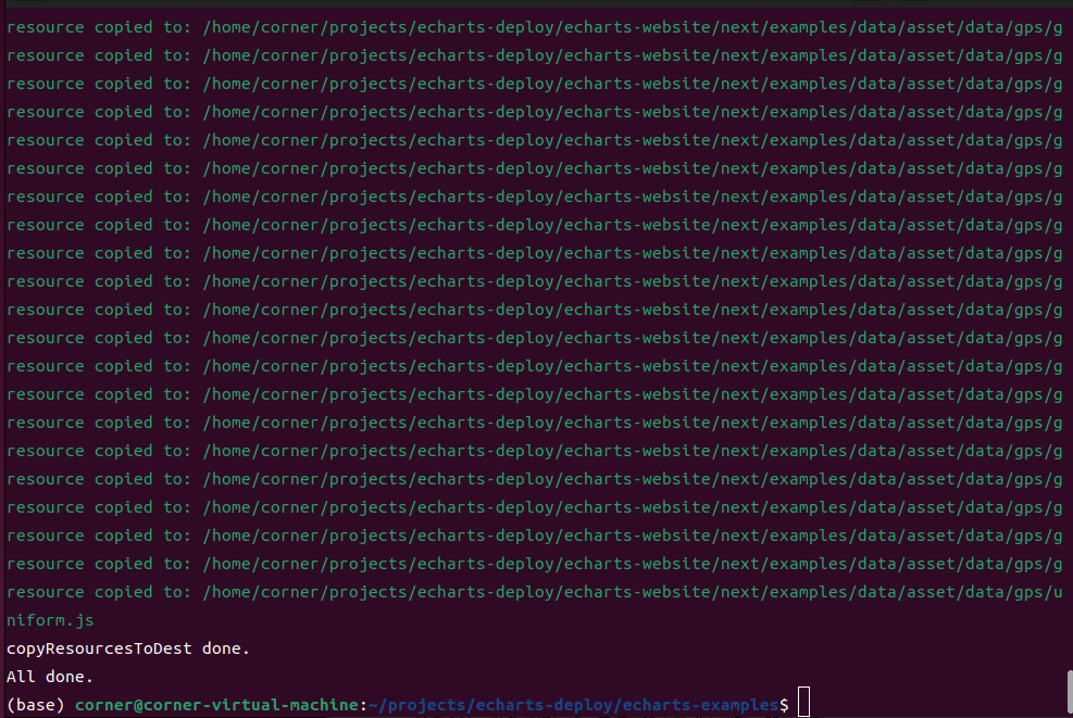 echarts-examples是示例的目录,我们进入目录,npm i安装依赖,然后执行npm run localsite构建,如果出现下面的日志就说明构建成功了: